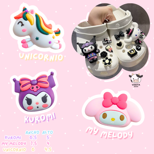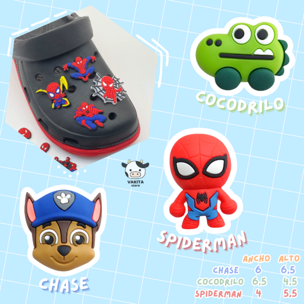 ✨ Personajes adorables como Chase, Cocodrilo, Spiderman, Kuromi, My Melody y Unicornio para que personalices tus crocs.